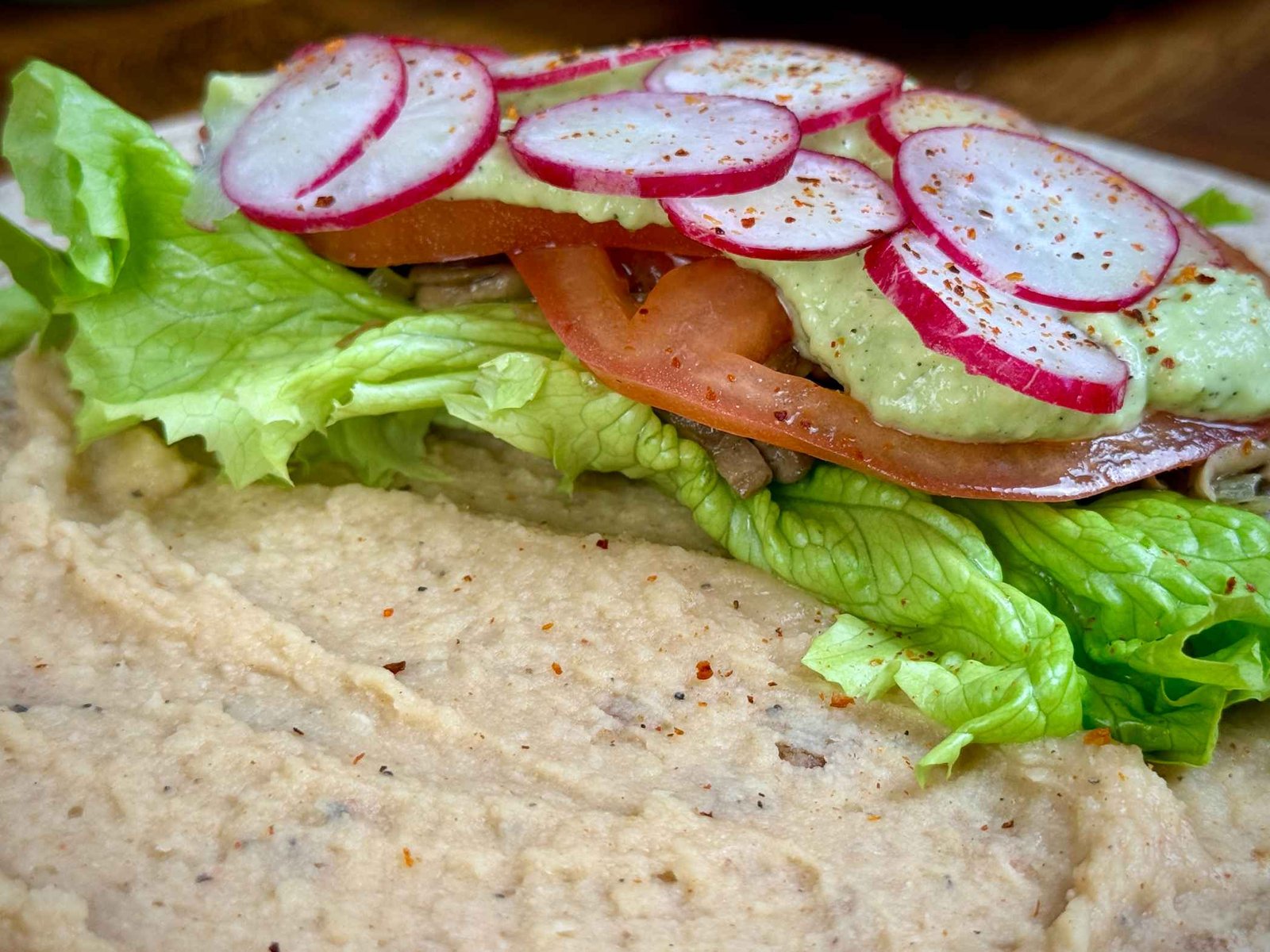 Na donju trćinu tortilje složite zelenu salatu, pržene gljive, paradajz i rotkvice jedno preko drugog. Sve prelijte avokado sosom i po želji pospite čilijem.